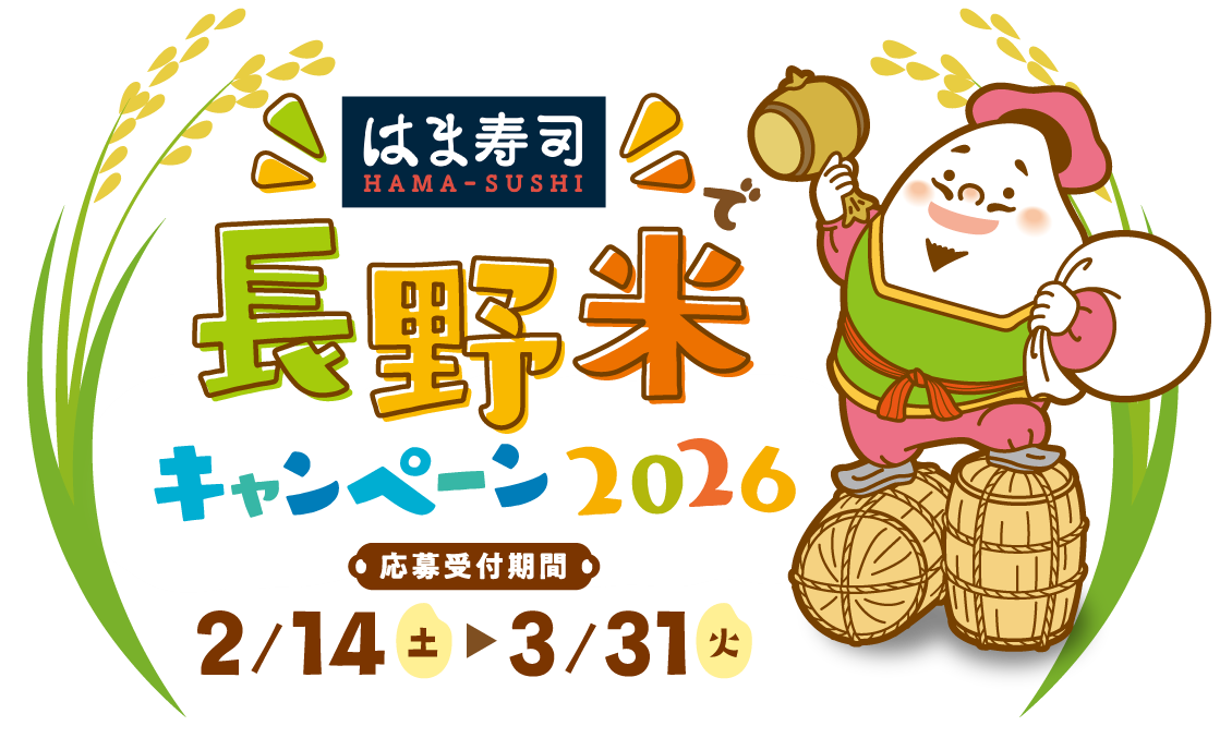安全・安心で美味しい地元のお米“長野米”を、もっとたくさんの皆様に食べていただけるよう「はま寿司で長野米キャンペーン」を実施いたします。ぜひ はま寿司 の店頭でご応募ください。